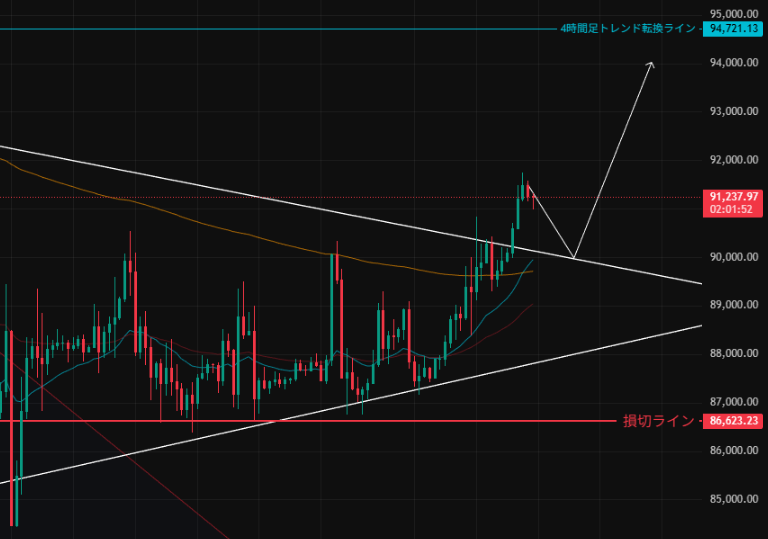 - ただし、損切ラインが$87,000~86,000あたりと深くなるため、現在価格からの飛び乗りはせず、リスクリワードが整う位置まで待ってエントリーを検討します。