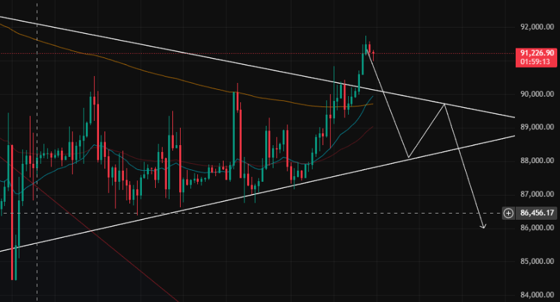 - $91,000まで上がりましたが、ここでレジスタンスされ、また下に戻されて安値を切り下げる展開。