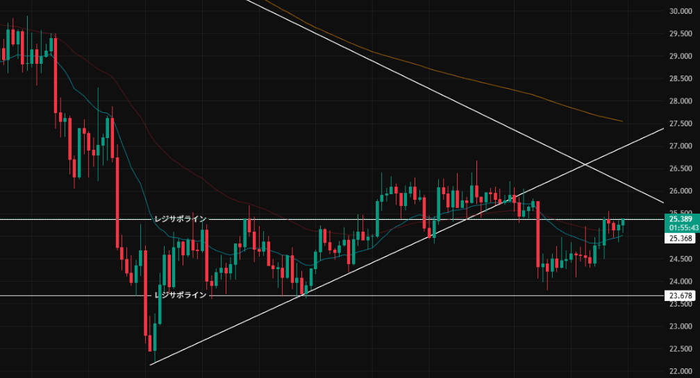 - トレンドラインを下にブレイクした後も、12月末の安値までは落ちずに戻ってきている(底堅い)