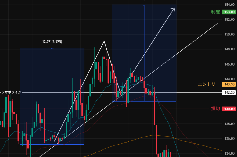 - 上抜け後、戻ってきたところをレジサポ&トレンドラインへの反応をみてロング