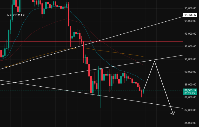 $88,000付近で一度底を打ち、上昇するパターンです。